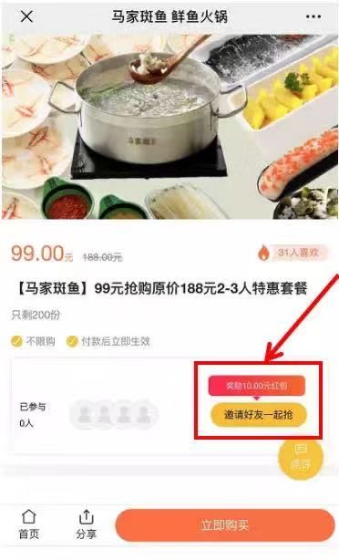 选好主推商品后,价格的确定也很重要,马家斑鱼通过排队网微商城分销推广的特点,将原价188的商品套餐,以99元超低价格售出,其中商品的利润都让利给推广员,粉丝不仅能以超低的价格购买到商品,也能分享给好友购买,每单可获得10元的红包奖励。