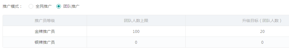 团队推广分为金牌和银牌两个等级,默认银牌推广员。团队推广的好处就是推广商品的团队人员均可以获益,按照不同等级获取不同的利润,可以有效的发展更多的人员加入团队,积极推广商品。