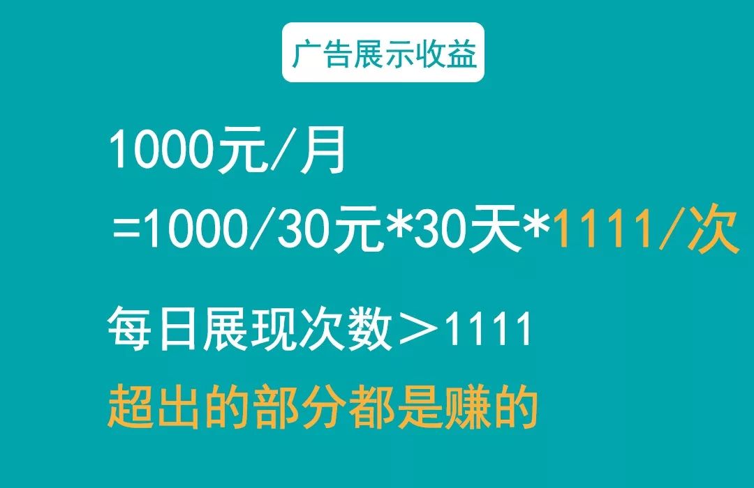 代理商可通过用户完成支付后的页面进行广告展示,按市场价展现1000次30元来算,一次展现是0.03元,成本是1000元/月,分摊到每日广告展现次数=1000÷0.03÷30=1111次。