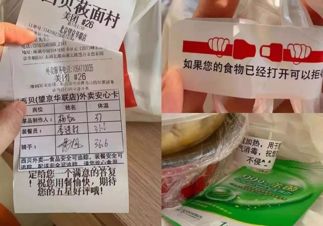 西贝在全国的三百多家门店闭店后,仍有少部分保留了外卖业务,并在外卖上延续一贯的高标准,在疫情期间,增加岗位员工体温测试、餐具消毒两大举措,推出“外卖安心卡”的服务,从菜品制作、配菜、送菜每个环节的人员体温数据都一一记录,赢得一大波顾客好评。