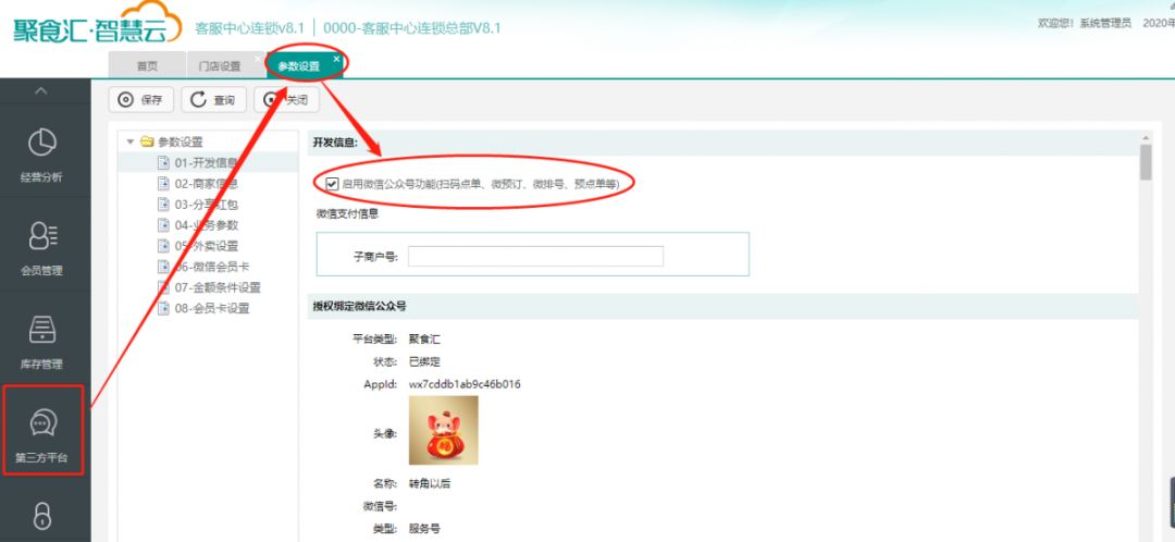 登陆聚食汇后台绑定公众号后,在第三方平台→参数设置→勾选“启用微信公众号功能”。