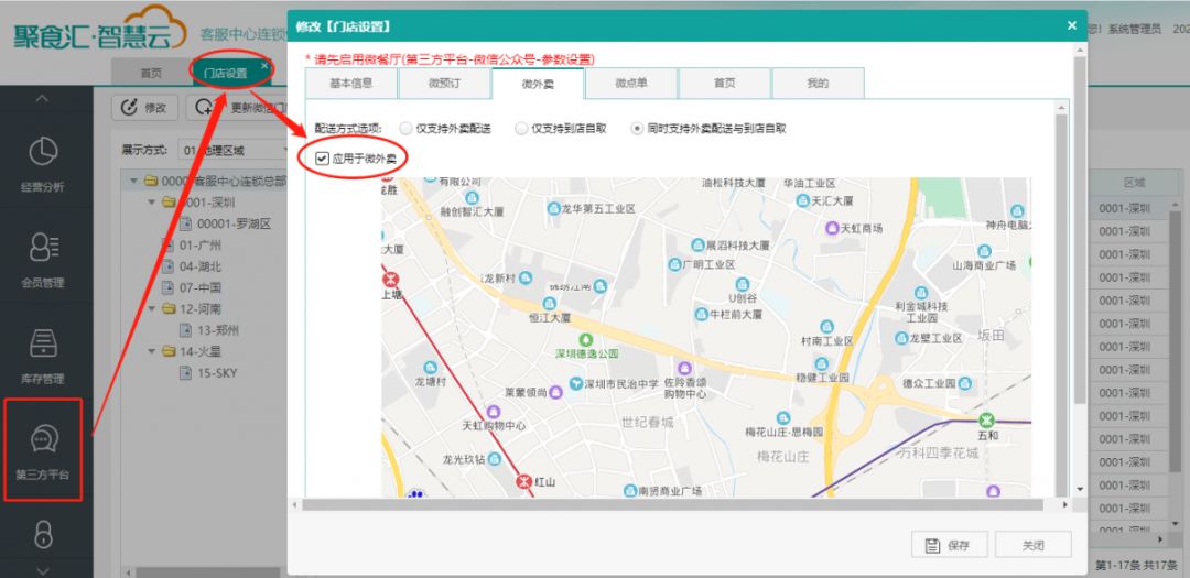 第三方平台→门店设置→勾选“应用于微外卖”,同时可设置配送方式。