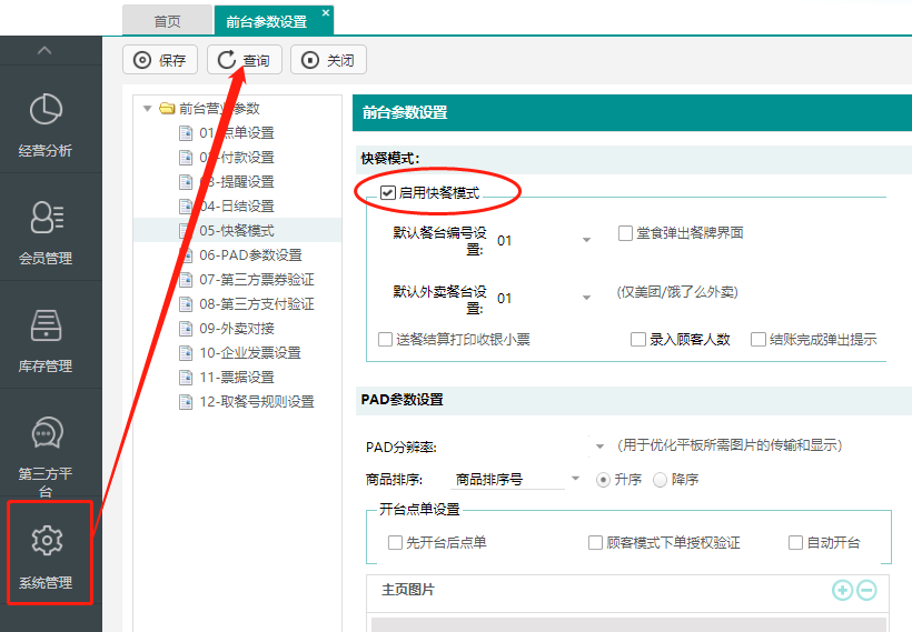系统管理中→选择前台参数设置→勾选“启用快餐模式”。