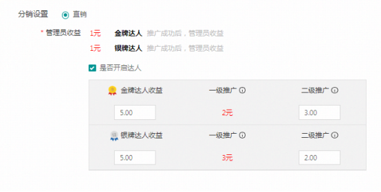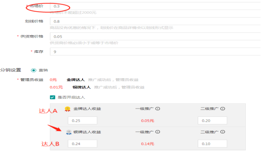 如:假设某件商品售价为0.3元,设置的分佣金额为金牌达人可得返佣0.25元,银牌达人B得0.24元。如下图: