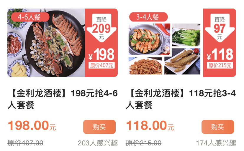 经过前期的熟悉过程,随后不断的在商城上架更多的套餐,如双人餐和四人餐,值得注意的是,金利龙线上商城的套餐也与线下实体店的套餐内容和价格做了区分,消费者更容易感受到商城的专属套餐价格,形成消费习惯UI