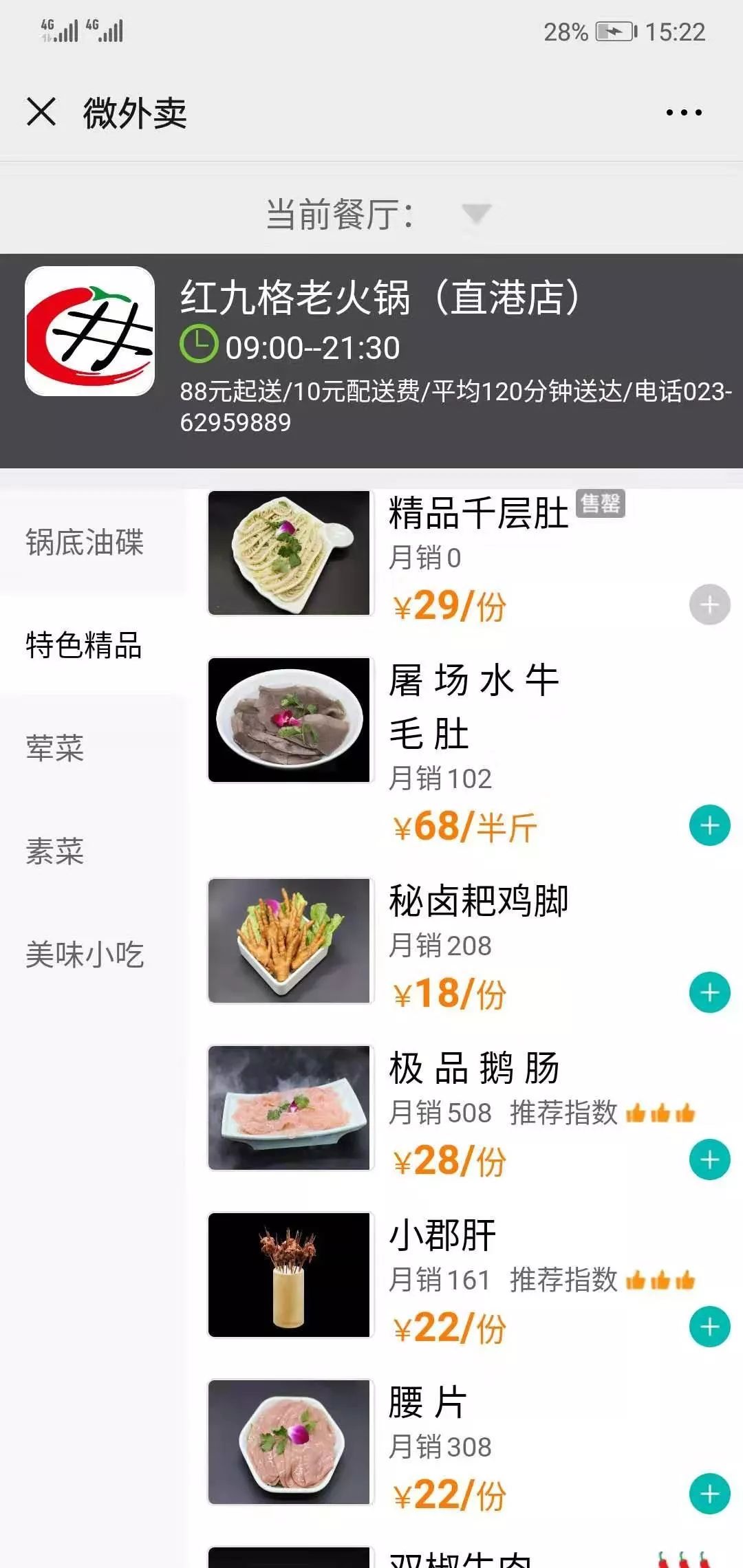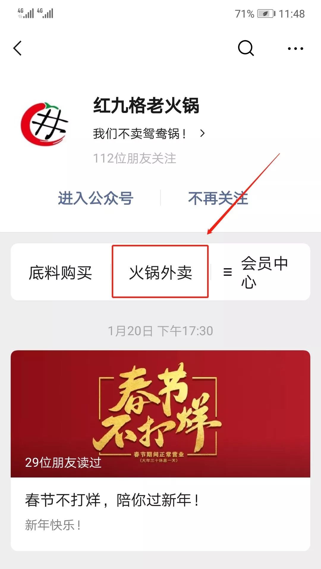 2月1日红九格就通过排队网微外卖功能在公众号上线火锅外送服务,需要用餐的顾客进入公众号菜单栏点击“火锅外卖”,就能够选择门店挑选下单。